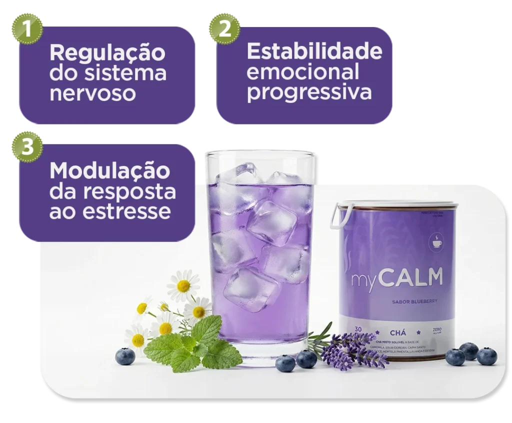 O myCALM é um Blend Neurocalmante desenvolvido para modular o estresse e reduzir a hiperatividade mental — sem sedação.Sem efeito rebote.Sem sensação de “mente lenta”.